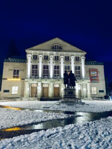 Am Abend besuchten sie das Nationaltheater Weimar und erlebten die Aufführung „Hoffnung – Schiller synthesied“. Das Stück verbindet klassische Texte Friedrich Schillers mit elektronischen Live-Klängen. Erzählt wird es vom Schauspieler Sebastian Kowski, musikalisch umgesetzt von den Percussionisten Simon Lauer und Timo Schmeichel.